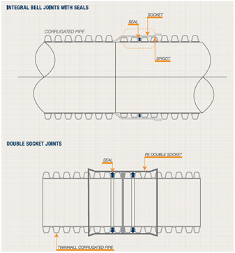 KAI recommends jointing of the KAI Corrugated Pipes by seal and integral cuff joints OR double socket joints.